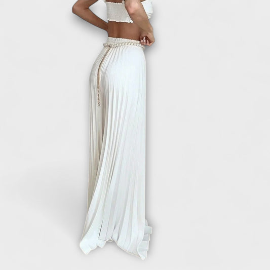 Evangeline - White Pleated Blouse with Wide-Leg Pants and Cardigan