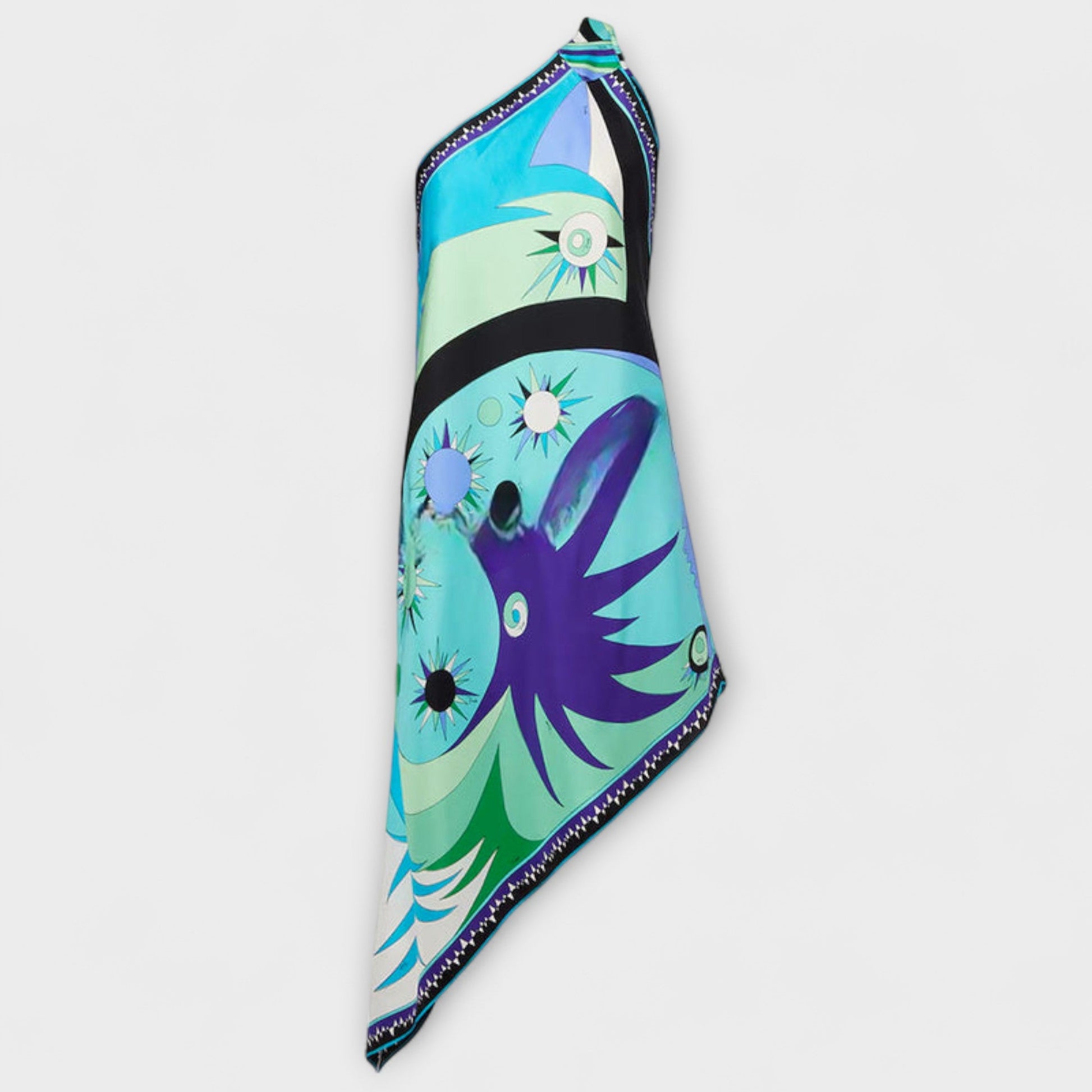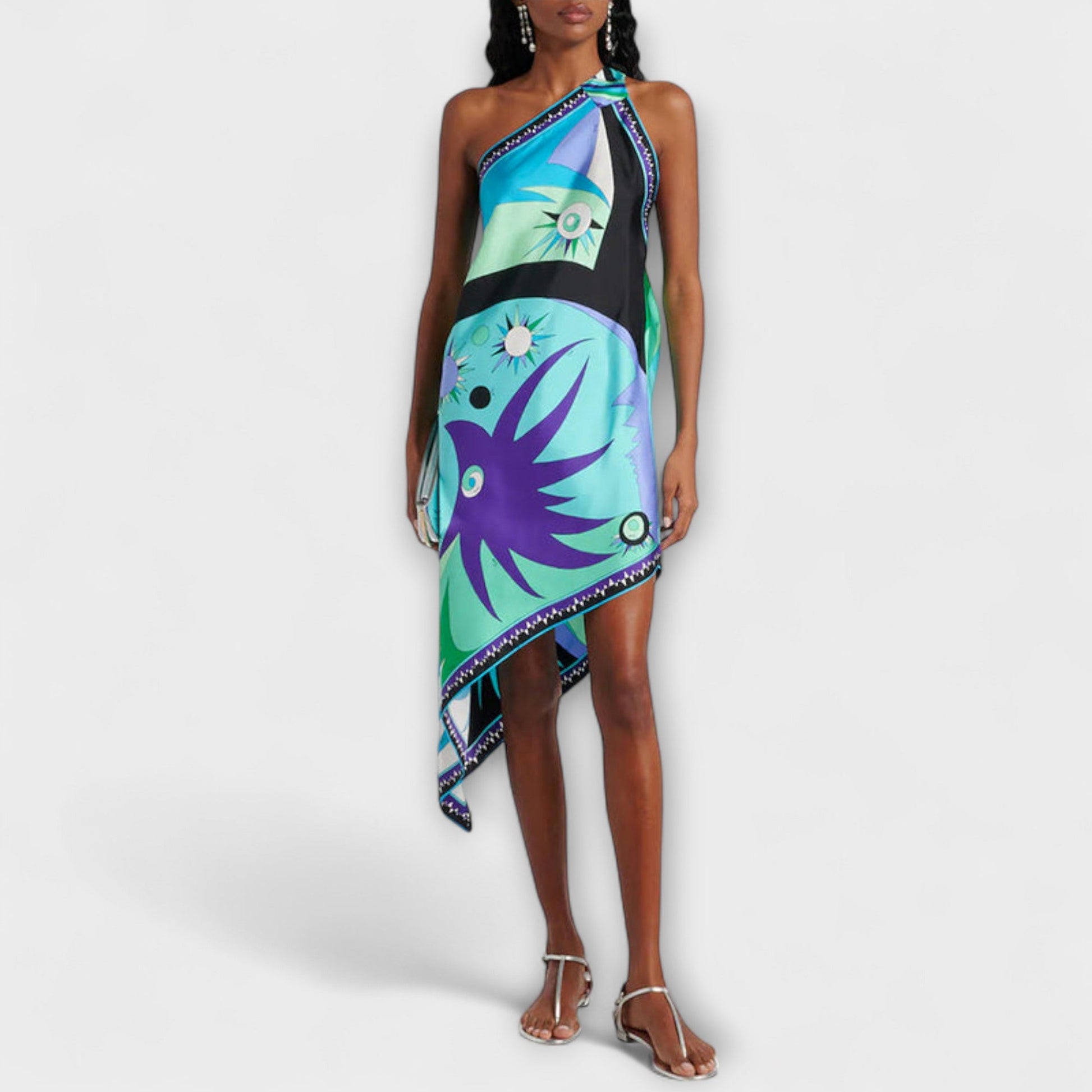 Esme - Unique Printed Satin Midi Dress with Asymmetrical Hem