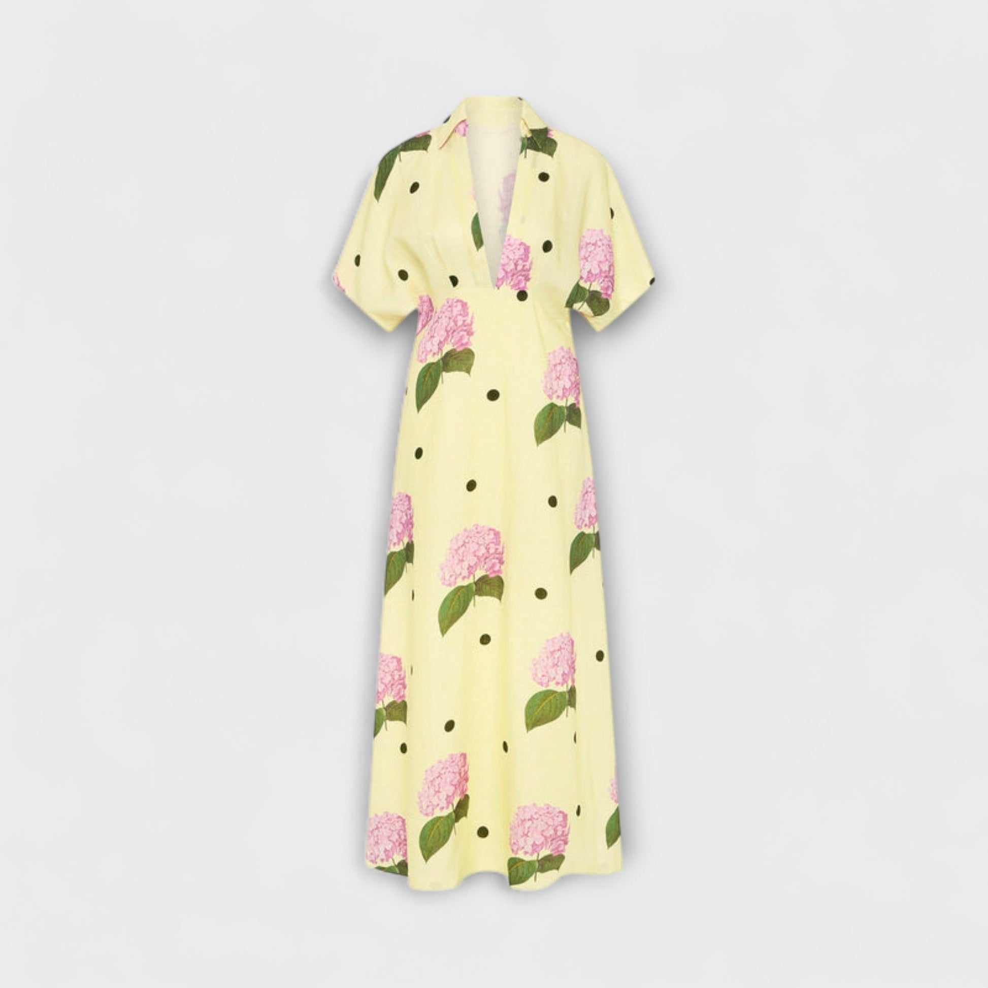 Alondra Long Dress with Fantasy Floral Print and V-Neck